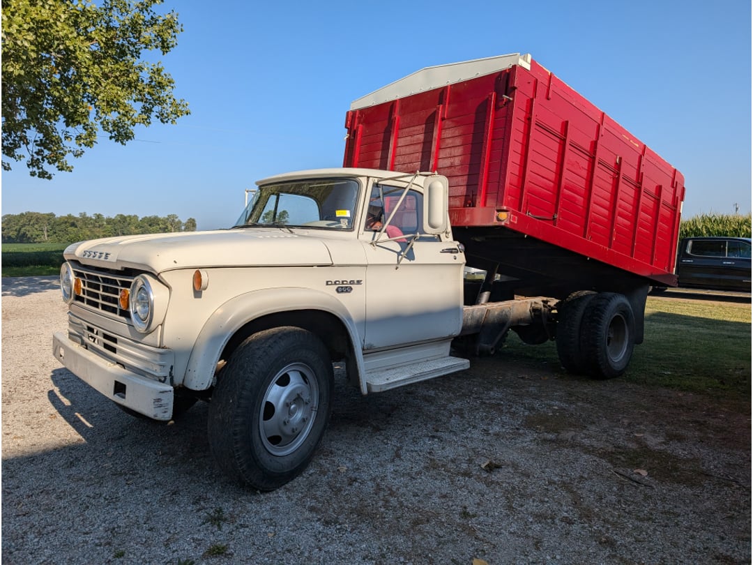 Lot 20 1965 Dodge D600 Grain Truck 360 Gas, Reads 71,563 Miles, 5 Speed w/ High Low Split Shift, 175" WB, 7k Fronts, 17k Rears, 14' Omahaul Bed, 54" Sides w/ Hoist Double Frame, VIN:1681536169