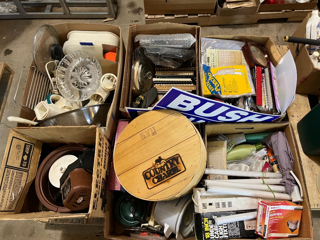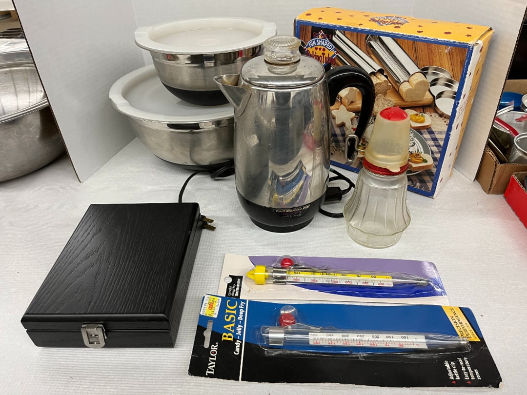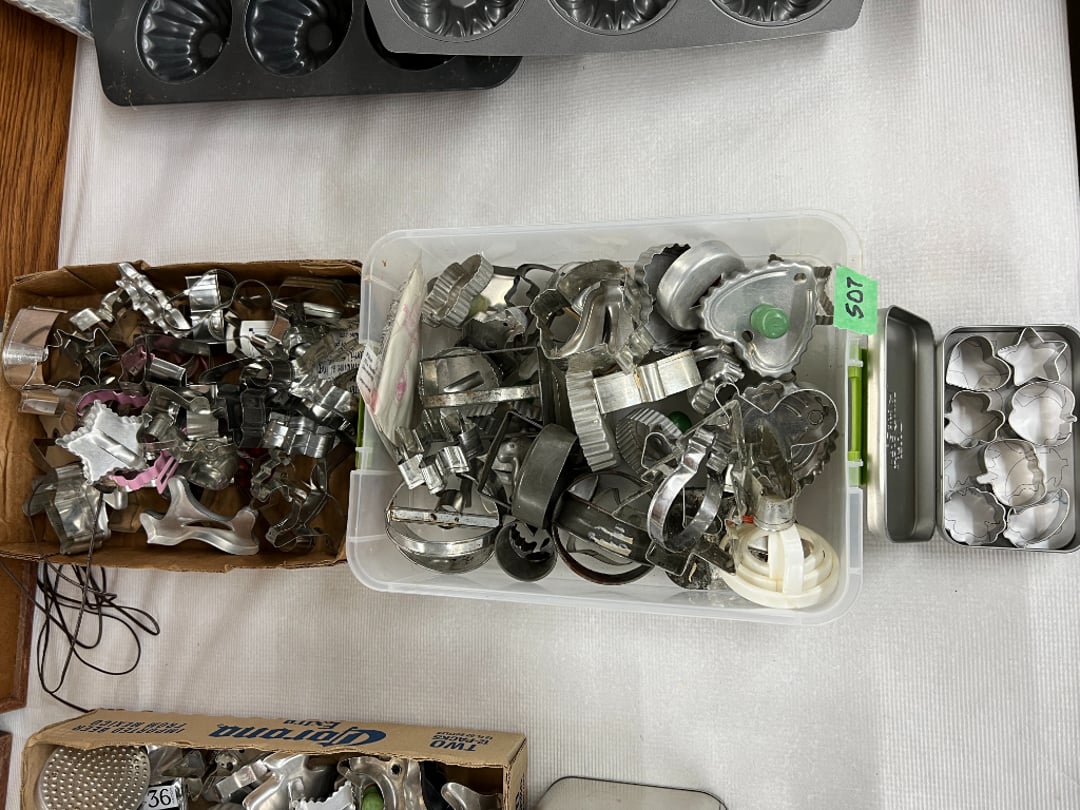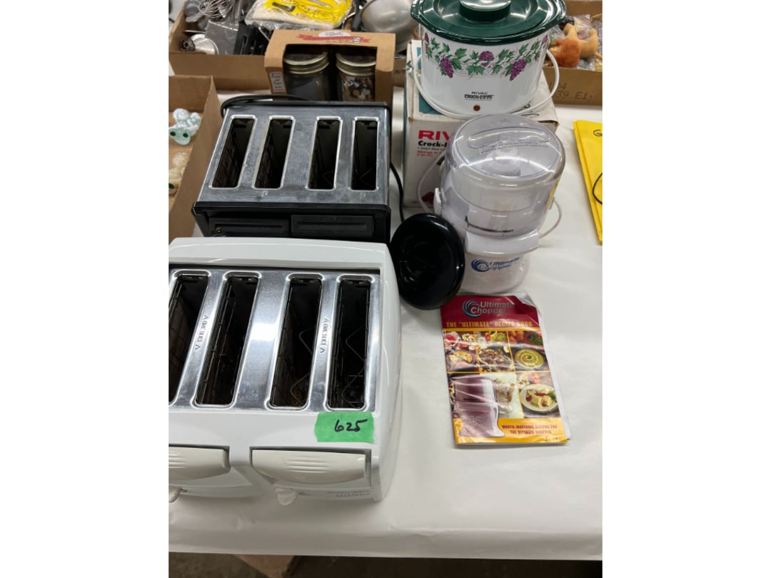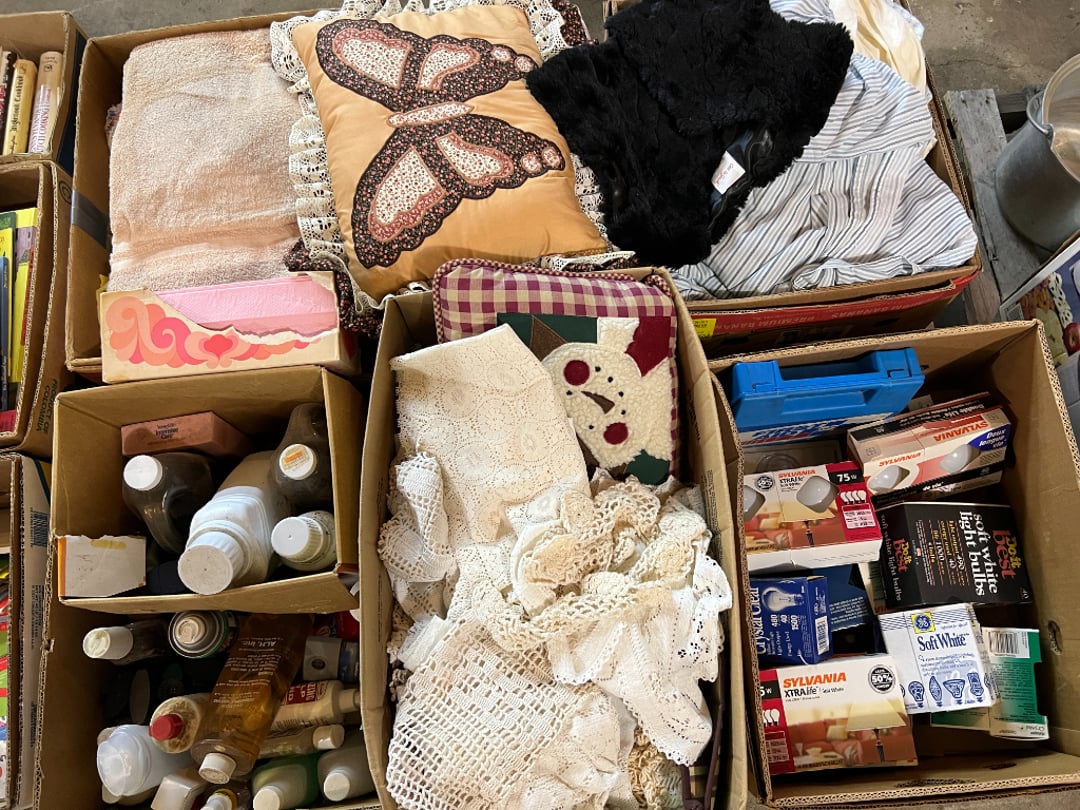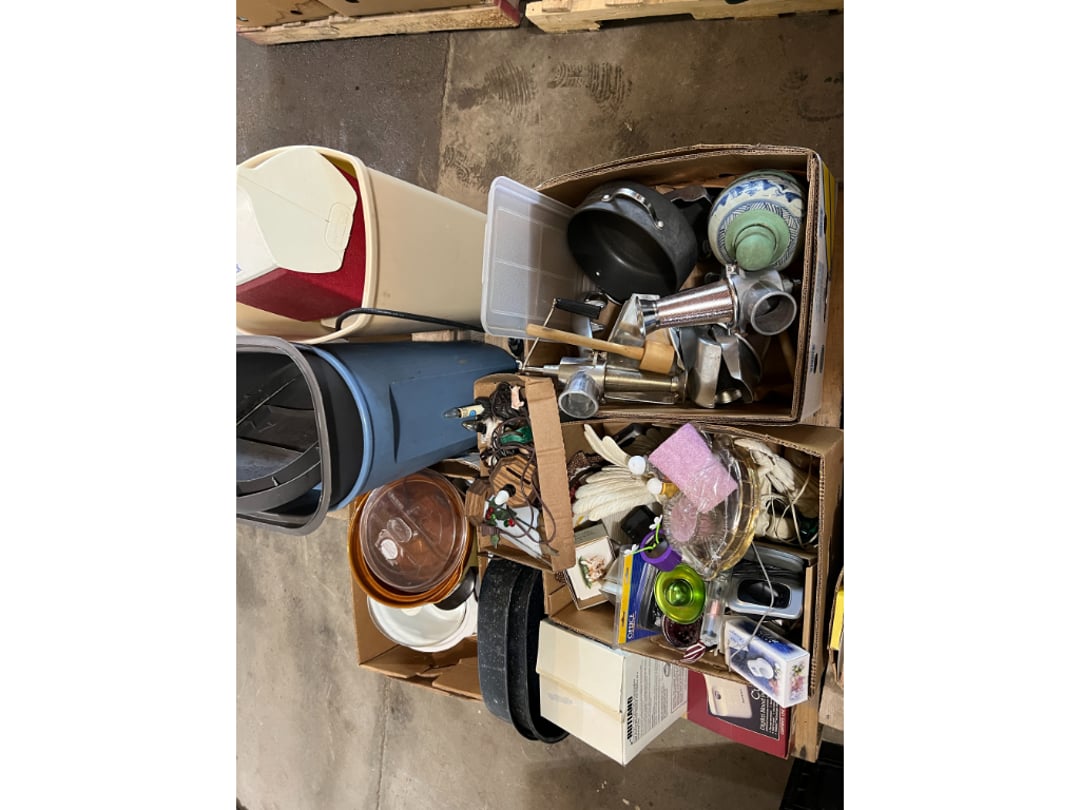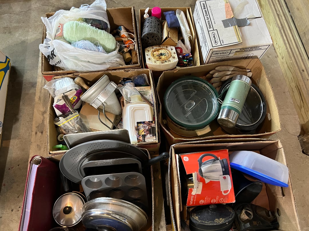 Butterfly Quilt 84" x 82", Child's Quilt 56"x48" & Blanket 47"x42", Knotted Bedspread 88"x60", 2 Vintage Quilts, 2 Vintage Quilts 82"x70" & 73"x52", Blow Mold Lighted Santa, Child's Oak & Bamboo Mirrored Dresser, NIB 55pc.Texas-Ware Dish Set, NIB 55pc.Texas-Ware Dish Set, Aroma Roaster Oven, Sylvania Ionizer Fan, Mini Yum Yum Machine, Sunbeam Ice Cream Maker, Rival Mini Meat Grinder/Stuffer, Waring Food Dehydrator, GoWise USA Pressure Cooker , Igloo Industrial 5 gal. Drink Cooler, Excalibur Food Dehydrator, Kenmore Microwave, Cooks Essential Steamer, Bella Fluted Cake Maker & Hand Mixer, JC Penny Oscillating Fan & Patton Fan, Rival Crock-Pot & NIB Handmixer, Magic Chef Ice Maker, Rival Crock-Pot , Wards Signature Ice Cream Maker, CorningWare Programmable Slow Cooker, DeLonghi 60 Cup Coffee Maker, West Bend Colonial Cooker , Rival Crock-Pot, Casserol Crock-Pot, West Bend Buffet Server , Sm. Crock-Pot & Rival Crock-Pot, Rival Crock-Pot & Frypan Electric Skillet, Presto Cast Aluminum Fry Pan, Euro-Pro Digital Slow Cooker, George Forman Evolve Grill , Sunbeam Carousel Rotisserie, Cuisinart Blender/Food Processor , Crosman 600 Pellet Gun, Fairport, NY, Walther CP 88 Competition Pellet Gun, "Benjamin Franklin" Air Pistol 177, Benjamin Franklin Air Pistol 110, Crosman "130" 22. Cal., GE AM/FM Radio Cassette Recorder, Panasonic FM/AM radio cassette recorder, SONY Audio/Video Control Center, 2 Car Radios, Car Radio CD Player, Magnavox Cassette Recorder, Miscellaneous Electronics, Vintage Marbles, Radio Shack CD player, radio, cassette , Alpine FM/AM CD Recieiver , Sharp CD, Radio, Cassette Player, (3) Window Fans - Holmes & Duracraft, Vintage Groom Kewpie Bisque Doll, Vintage Records (33-45-78), (2) Stock Pots - , Presto Pressure Cooker & Stock Pot, Stainless Steel Stock Pot & Kettle Pot, (2) Stock Pots - 1 lid, Wagner Ware Magnalite Roaster, Lg. Wagner Ware Magnalite Roaster, Griswold 2qt. Pot & Sullivan Ware Pot, Magnalite Roaster & Pot, 3 pc. Magnalite Pans, Wagner Ware Magnalite Roaster (no lid) , Majestic ware pot with handle, stock, 3 Wagner ware Magnalite pans, 2 Magnalite Roasters, Mirro 8 liter & 14 qt Wearever Stock Pots, Cooks essentials 16 qt SS stock pot, 10qt Revere Ware SS Stock Pot, 16qt Tramontina SS Stock Pot, Vollrath SS Stock Pot, (4) Costume Jewelry , (2) Flats Costume Jewelry , Costume jewelry, (2) flats of costume jewelry, (3) Jewelry boxes with contents, (2) Flats of costume jewelry, Jewelry Chest, Jewelry Organizer, (3) Containers costume jewelry, (2) Flat custom jewelry, (3) Containers custom jewelry, (6) Farberware Pots and pans, SS double boiler, SS Roasting pan -, (4) pc SS Altima Cookware, (2) Nordic Ware & (2) Bunt pan molds -, (2) Granite roasters, Wagner ware, 14" Enterprise pan, (15) Baking sheets 13"x18", (8) Bakeware & Cooling rack, Character cake pans, round pans,, Graniteware pan – like new, Antique enamel bucket with lid, (3) Jacks, Milwaukee heavy duty 61/2" Saw, Miscellaneous tools, (3) Red Coca-Cola crates, Vintage joy time ice skates, vintage, Whites metal detector, Large amount of miscellaneous drill bits, Earthway EV–N -Spred grass spreader, (2) NIB Lazer Tag Systems, toys, Handy Andy 20 piece carpenters, (2) Barbie dolls, Madeline tea set, Wooden bunny rocker, fisher price, NIB Big bird express train, plastic farm buildings, Galileo Thermometer, (2) Vintage picnic baskets, (6) Baskets, (72) CD's & CD Containers, Child's suitcase with wheels & contents, William Lewis and sons violin, (1) Hohner, (1) Friend Harmonica,, Hans Jurgen Violin with case , SYNSONICS Acoustic Guitar FG907, May Bell - Acoustic Guitar With case, May-Bell Acoustic Guitar in case, Tambourine, Del Oro Acoustic Guitar with strap, Johnson Traditional Ukulele, First Act MG366 Acoustic Guitar, Autoharp , Quarz Guitar Tuner, Lady Bug Mandolin, Remo Weather King Banjo, George Washburn Mandolin, Rocky Mountain Dulcimer, Acoustic guitar, OAHU Publishing company Guitar, Vintage keys, padlocks, keychains, Jewelry assortment and compacts, Costume jewelry assortment with heel spoon, Custom jewelry – rings, broaches, cuff , (4) Boxes costume jewelry, Costume Jewelry, (3) Show cases of Costume Jewelry, (2) Flats Custom Jewelry, (2) Flats Costume Jewelry, (2) Flats Costume Jewelry, (3) Flats Costume Jewelry, (2) Flats Costume Jewelry, (2) Flats Costume Jewelry, (2) Flats Costume Jewelry, (2) Flats Costume Jewelry, (2) Flats Costume Jewelry, (2) Flats Costume Jewelry, (2) Flats Costume Jewelry, (2) Flats Costume Jewelry, (2) Flats Costume Jewelry, (2) Flats Costume Jewelry, (2) Flats Costume Jewelry, (2) Flats Costume Jewelry, (2) Flats Costume Jewelry, (2) Flats Costume Jewelry, (2) Flats Costume Jewelry, (2) Flats Costume Jewelry, (2) Flats Costume Jewelry, (2) Flats Costume Jewelry, (2) Flats Costume Jewelry, (2) Flats Costume Jewelry, (2) Flats Costume Jewelry, (2) Flats Costume Jewelry, (4) Boxes of cookbooks, (4) Boxes of cookbooks, (3) Boxes of cookbooks, (4) Boxes of cookbooks, (4) Boxes of cookbooks, (4) Boxes of cookbooks, (3) Boxes of cookbooks, (7) Antique reference books- Jewelry,, (4) Antique reference books- Collectibles, (5) Antique reference books - Tools, flea, (4) Boxes children's books, (3) Boxes children's books, Vintage last supper picture, (2) Boxes Cookbooks, Eagle pictures, 36"x24" Indian painted on velvet, (2) Containers of children's books, Large amount of Junior elf books, (2) Boxes of children's books, Assortment of children's activities and, Disney princess activities, Children's lunch bags and toys, Whitehead Hoag Letter Opener, Lincoln National Bank – book bank, Southern pacific RR lines playing, (2)Fountain pens, braves trucking pencil, Foreign coins, Leather coin pouch, (3) Miniature guns - Ranger Zee & 1 made, 1960's Kusan Inc. Toy Cap Gun, Togepi POKEMON 1999 23K gold, Copper eagle and arrows letter opener, RadioShack handheld digital trunking, (2) Plastic containers of doll clothes/, Brass Elephant, cast iron dog, China egg, Chunky stamps, super set gear