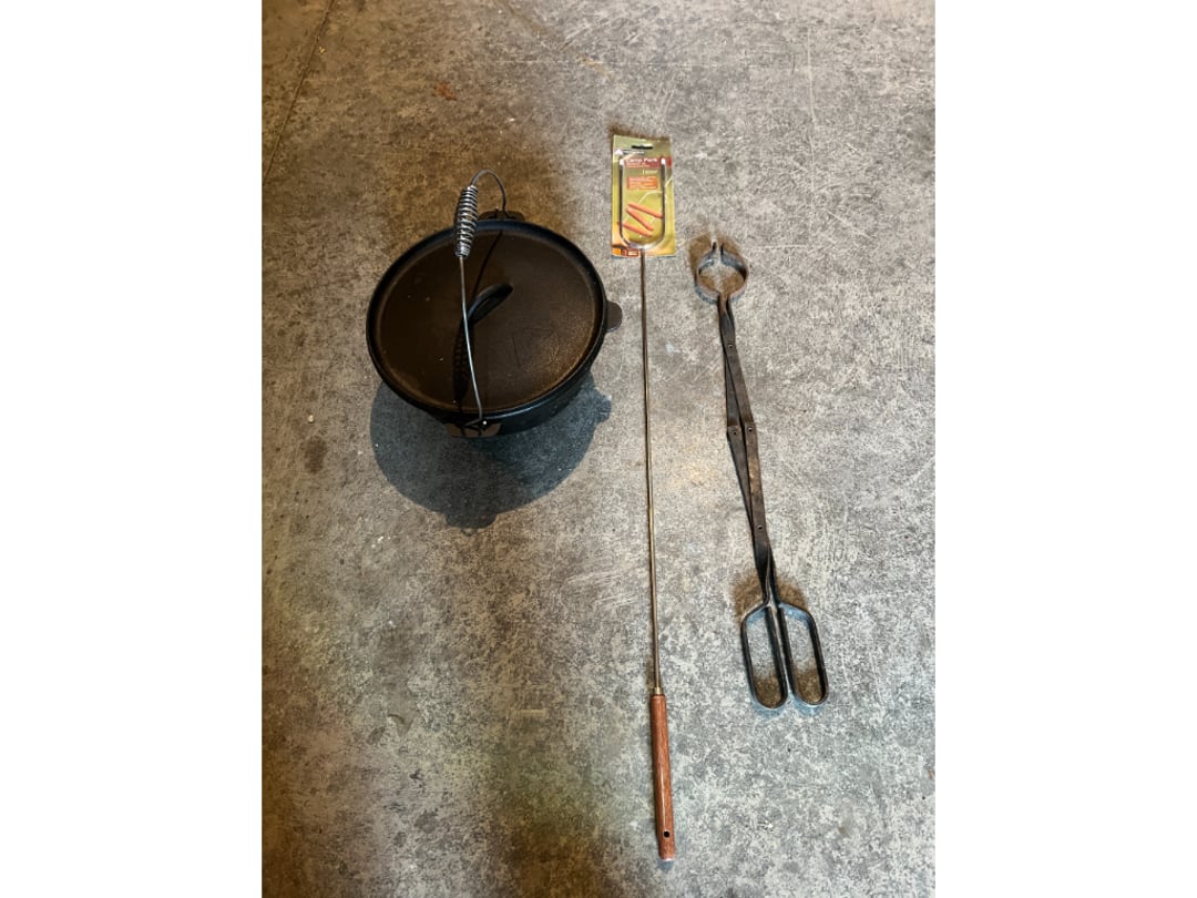 • Cast Iron Camping Dutch Oven, Fire Tongs, Fork (Lot #154)