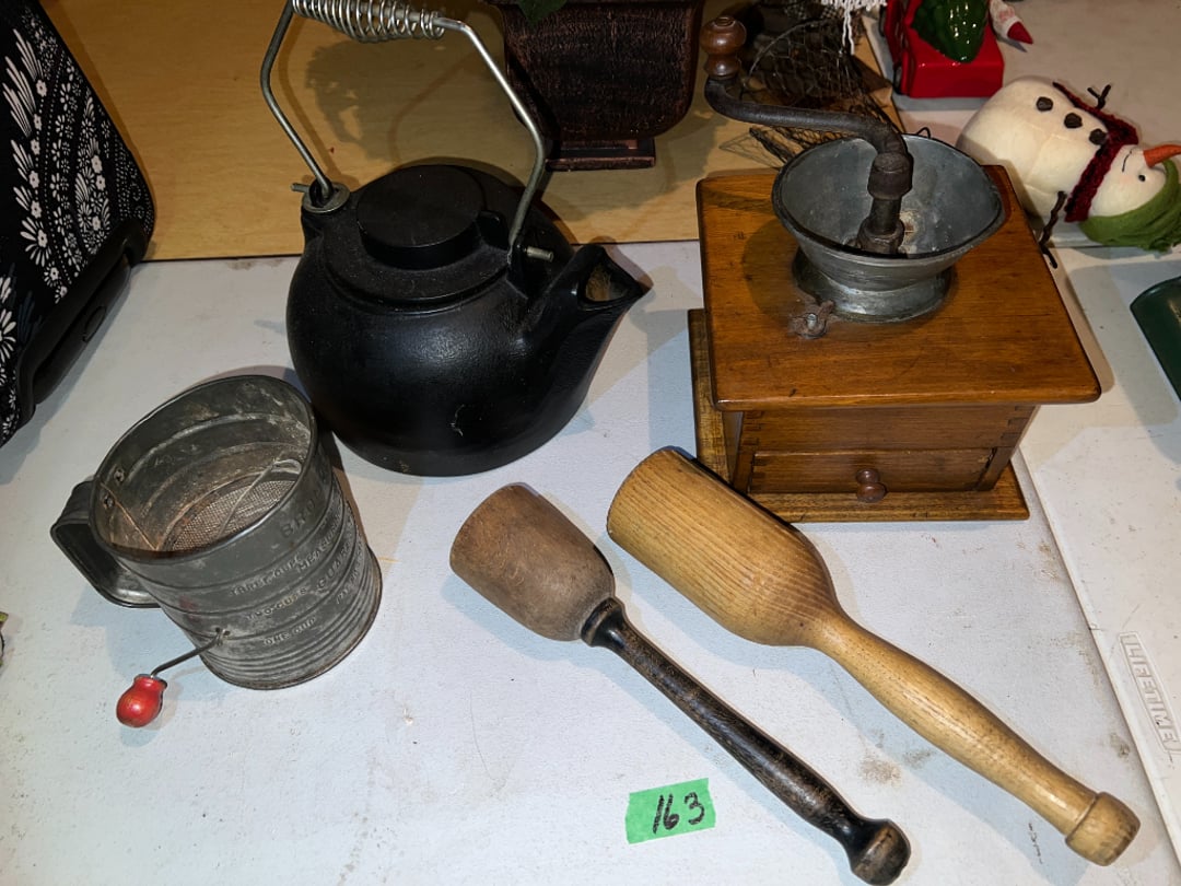 • Vintage Cast Iron Pot, Coffee Grinder, Stompers, (Lot #163)