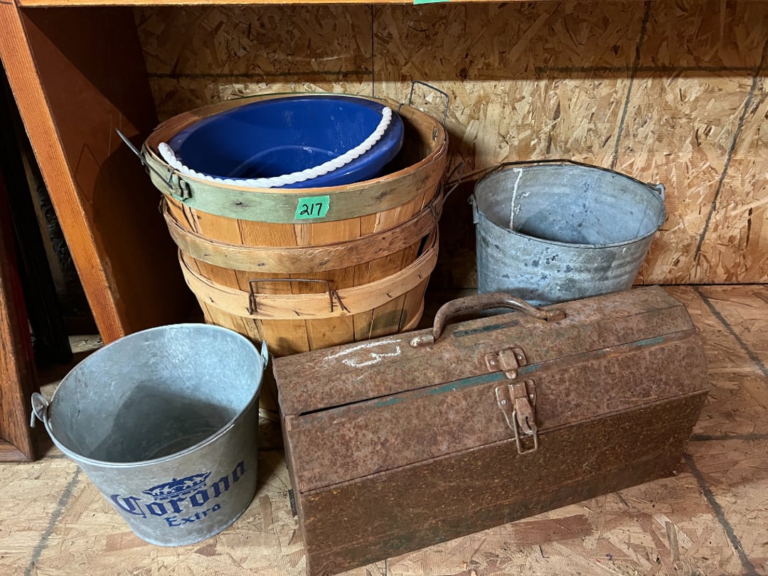 • 1/2 Bushel Baskets, Buckets, Vintage Tool Box (Lot #217)