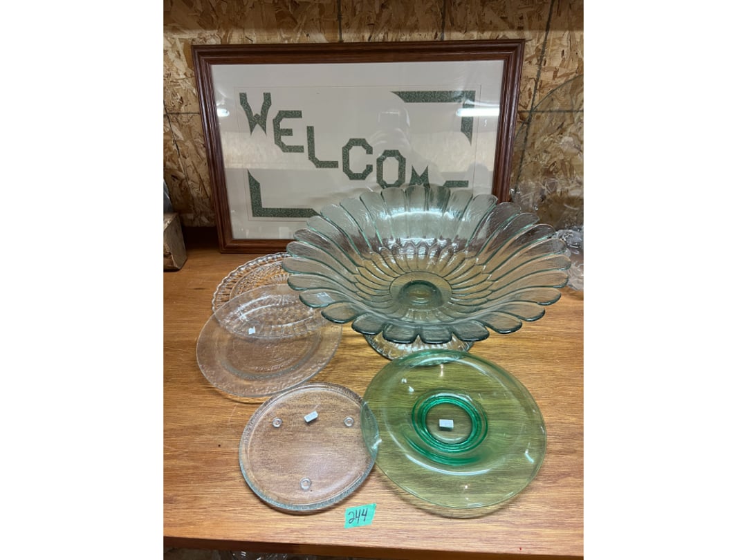 • Lg 1920's Daisy Green Glass Bowl, Welcome Sign, (Lot #244)